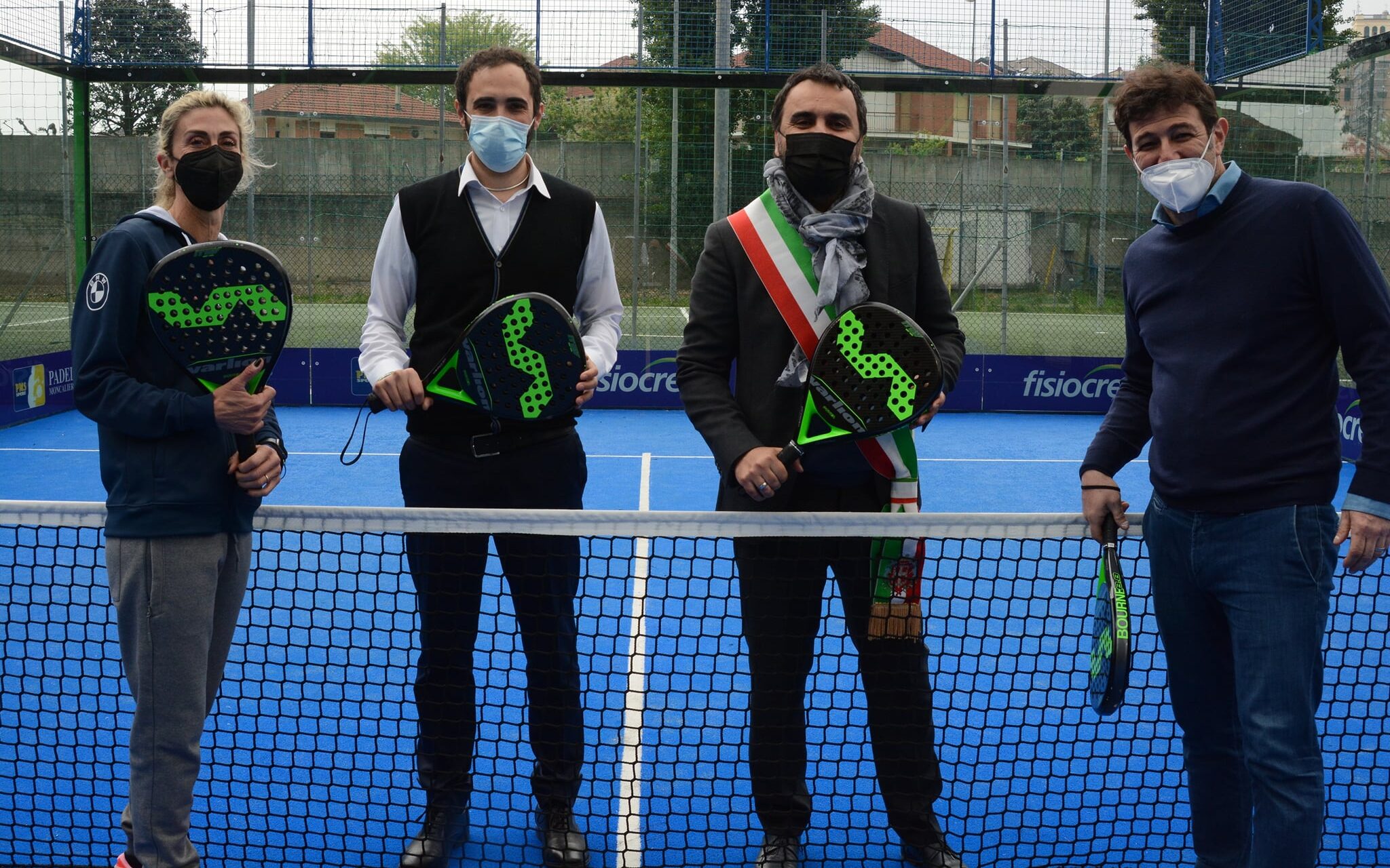 Dopo il simbolo “taglio del nastro”, un simpatico siparietto per il Sindaco e l’Assessore, che hanno scambiato due colpi sul campo appena inaugurato, sfidando Ferrara e Carlotta Colombo, giocatrice professionista e insegnante di Padel dell’Impianto Einaudi.